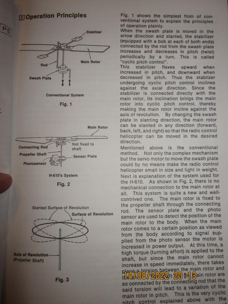 Akkuja ei jaksanut oikein kantaa, tuolloin ei ollut vaihtoehtona kuin Nicd -kennoja (litiumit teki tuloaan puhelimiin) eli powerista naru kopukkaan, akksi hyrrägyroa, harjalliset moottorit, 27MHZ AM-ratiot jne. Jonkinlainen kontrolleri ohjaa moottoria, aika rajuilla sykäyksillä, mutta toimi kuitenkin oletetusti. Akselit kuulalaakeroituja, mukaan kolme paria lapoja ja harjoitustelineet...